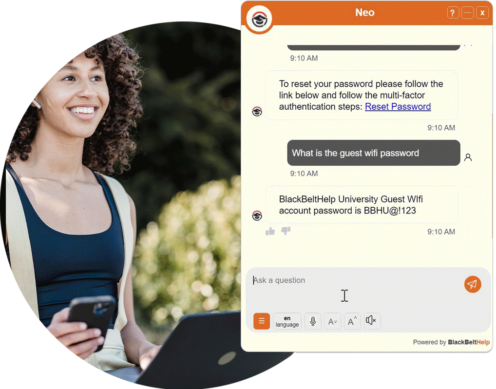 Answer every question from a single point of contact. BlackBeltHelp’s AI bots securely unify and personalize the student experience.